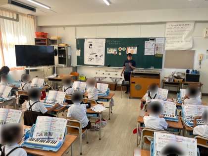 1年生は音楽の学習です。「どとそのおととともだちになろう」というめあてを立てて鍵盤ハーモニカの練習をしました。「どんぐりさんのおうち」という曲を演奏しながらド、ソの音や鍵盤の位置を確かめました。