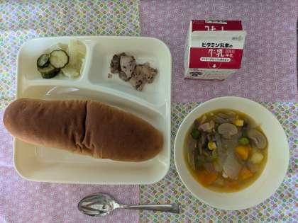 鶏肉のバジル焼き、ベーコンと野菜のスープ煮、キャベツときゅうりのサラダ、黒糖パン、牛乳