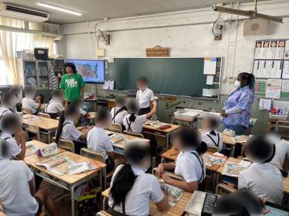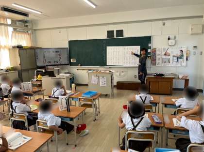 5年生は外国語の学習です。色々な動作や行動の表現の仕方を練習するため、身振り、手ぶりを使ってクイズをつくり、その様子を英語で表現しました