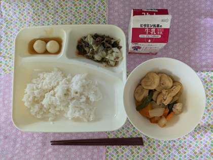 今日は、月見の行事献立としてさといもと、だんごを使いました。