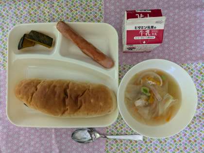 ウインナーのケチャップソース、スープ、焼きかぼちゃ、おさつパン、牛乳