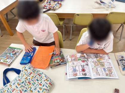 1年生は図書の時間です。図書室で静かに読書をしました。ジブリの絵本やサバイバルの本などが人気です。いったん本を読み出すと、子ども達は読書に夢中です。