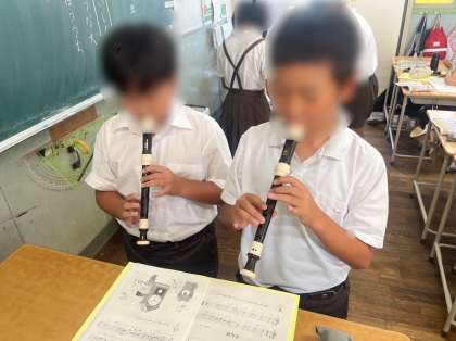 5年生は音楽の学習です。今日は2人ペアになって、先生にリコーダーの課題曲「大きな古時計」を聴いてもらいました。運指やタンギングに気を付けながら、落ち着いて演奏することができました。