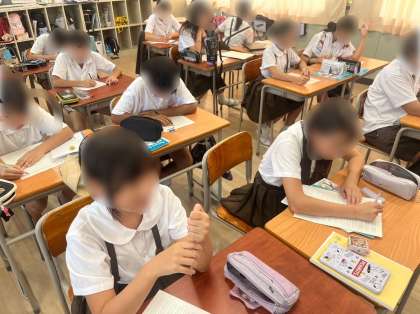 6年生は外国語の学習です。普段は英語を話したり、聞いたりする活動が多いのですが、今日は書く活動です。アルファベットのAからZまで、大文字と小文字で書く練習をしました。gやyなどに気を付けながら丁寧に書くことができました。
