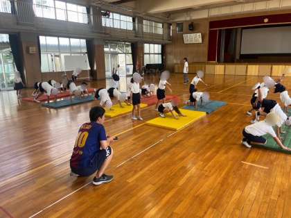 2年生は、体育で跳び箱の学習に入りました。跳び箱の学習にあたっては、マットや跳び箱の準備をしなければいけません。今日は体育用具の運び方などを教えてもらった後、跳び箱の基本の運動となる「かえる跳び」を練習しました。