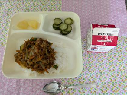 大豆入りキーマカレーライス、きゅうりのサラダ、洋なし(カット缶)、牛乳