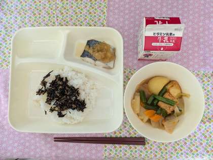 さごしのおろしじょうゆかけ、含め煮、牛ひじきそぼろ、ごはん、牛乳
