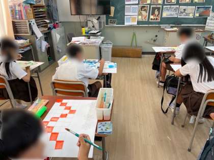 6年生は、図工でした。伝統の文様の美しさに触れ、子どもたちが感じ取ったり、イメージを膨らませたりしたことを自分だけの文様としてバランスや色合いを意識して表現しました。