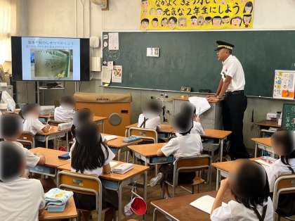 2年生は生活科で公共の施設について学習をしています。今日は、阪神電車の方にゲストティーチャーとして来ていただき、鉄道の仕事をわかりやすく教えていただきました。