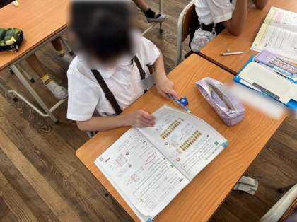 3年生は算数で「大きい数のしくみ」について学習のまとめをしています。これまでの学習をふり返り、復習をした後、確認テストに取り組みました。