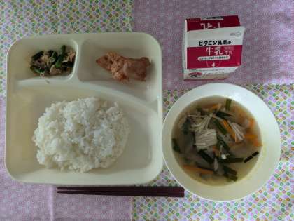 鶏肉のチリソース焼き、焼き豚のスープ、ツナとさんどまめのオイスターソースいため、ごはん、牛乳
