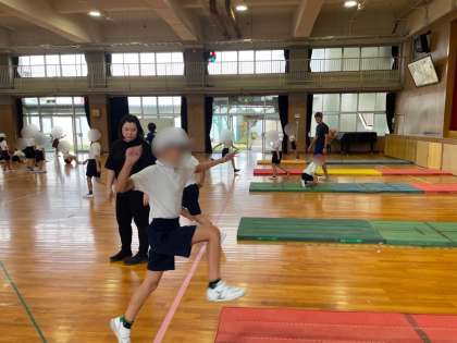 3年生は体育で走り幅跳びの学習をしています。今日は講堂にマットを敷いて、踏切や着地の練習をしました。踏み切る足や両足での着地を意識して練習しました。