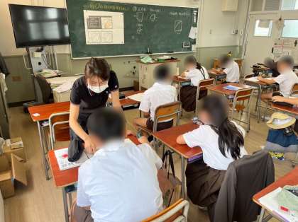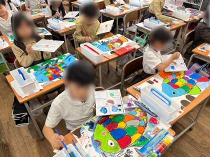 2年生は図工で「カラフルなさかな」という作品を制作しています。パスをしっかり塗り込んで描いた魚に絵の具を使って丁寧に色付けしていきました。