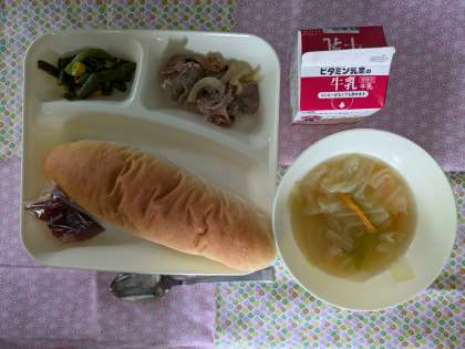 豚肉のガーリック焼き、鶏肉と野菜のスープ、さんどまめとコーンのソテー、コッペパン、いちごジャム、牛乳