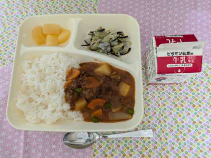 ハヤシライス、キャベツのひじきドレッシング、白桃(カット缶)、牛乳