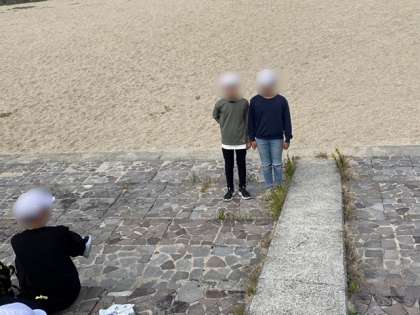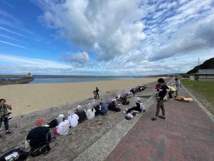カッター体験の後は、海を見ながらお昼ご飯です。これからの活動に備えてしっかり食べています。外で食べるお弁当は美味しいです。