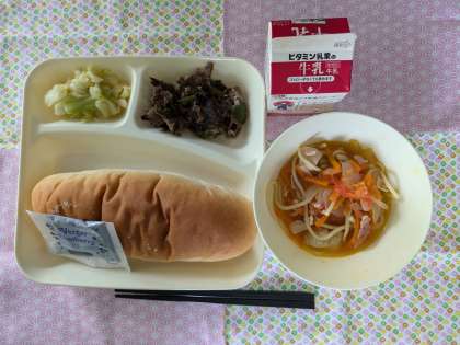 牛肉の香味焼き、トマトのスープスパゲッティ、キャベツのサワーソテー、ブルーベリージャム、コッペパン、牛乳