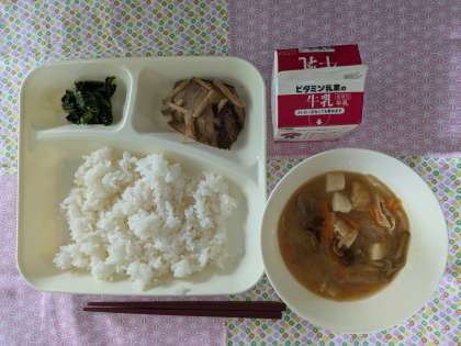 なまりぶしのしょうが煮、なめこのみそ汁、ほうれんそうのごまあえ、ごはん、牛乳