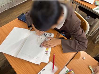 3年生は算数の学習で円の中心を見つける方法を考えました。中心がわからない時は円を切り取り、何回か二つ折にして、折り目が重なるところが中心になることがわかりました。