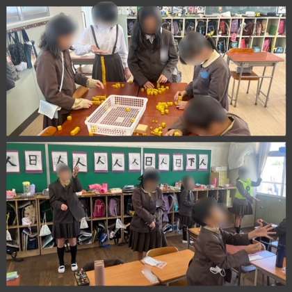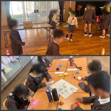 今回は、お手玉、積み木、けん玉、折り紙の4つの活動を順番で行いました。子どもたちはたてわり班で協力しながら活動を楽しむことができました。