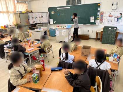 1年生は算数で「かたちあそび」の学習をしています。グループになって色々な形の容器を手に取り、ボールの形、サイコロの形など形を分類していきました。