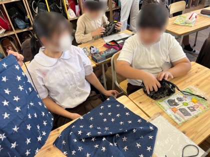 5年生は家庭科の学習でおべんとうつつみを制作しています。このおべんとうつつみは、お弁当つつみだけでなくランチョンマットにもなります。友だちと見せ合いながら、丁寧に制作していきました。