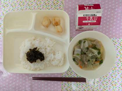 今日の給食は、ごはんに手作りののりのつくだ煮を添えました。