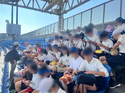 午前の競技が終わり観覧席でランチタイムです。しっかり食べて次の競技に備えています。