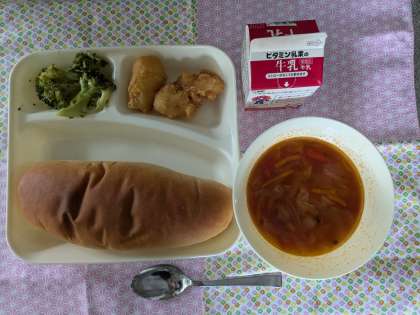 白身魚フリッター、ミネストローネ、ブロッコリーのサラダ、黒糖パン、牛乳