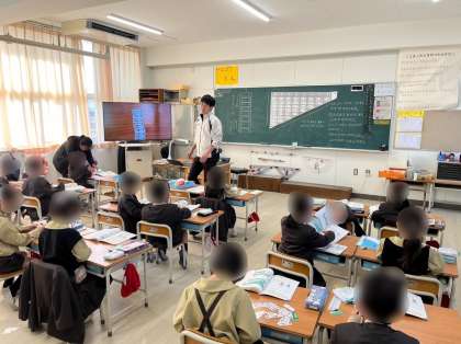 1年生は算数の学習です。ひき算の計算カードを数の小さいものから順番に並べて気づいたことを交流しました。「横にいけば、後ろの数が大きくなる」「ななめで見ると後ろの数が同じ」など、色々な気づきを発表できました。