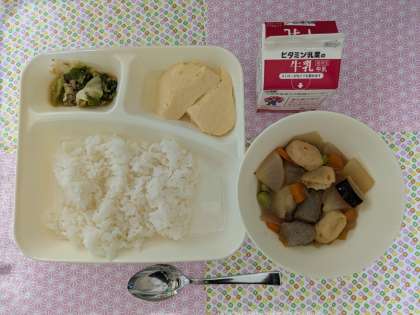 卵どうふ、一口がんもと野菜の煮もの、キャベツとピーマンのそぼろいため、ごはん、牛乳