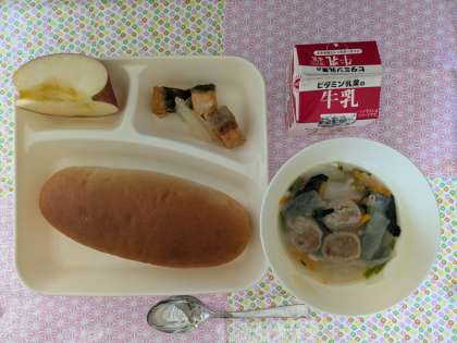 さけのマリネ、肉だんごと押麦のスープ、りんご、黒糖パン、牛乳