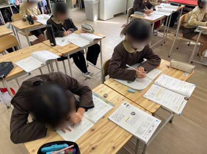 4年生は算数で分数のひき算を学習しています。分数のひき算もたし算と同じように仮分数になおしたり、整数部分と分数部分にわけたりして計算していきました。方法になれると、黙々と計算に取り組んでいました。