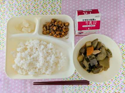 鶏肉と野菜の煮もの、じゃこ豆、かぶのゆず風味、ごはん、牛乳