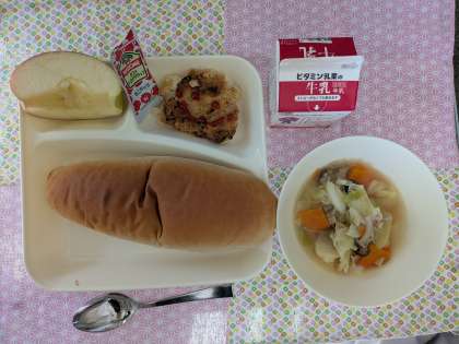 とうふローフ、カリフラワーのスープ煮、りんご、黒糖パン、牛乳