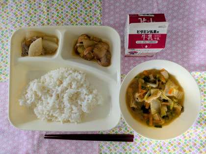 鶏肉の甘辛焼き、みそ汁、だいこんの煮もの