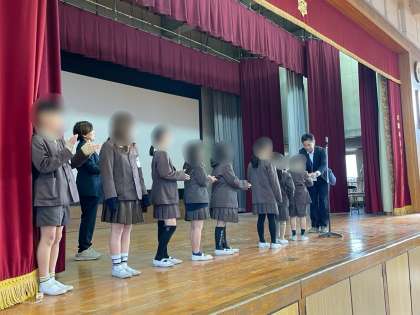 4時間目に終業式を行いました。校長先生からは、冬休みの間に自分のことを振り返り、新年にさらに成長するための心構えをしておきましょう、といったお話がありました。また、先日実施した「なわとび週間」で規定回数をクリアした学級に表彰状が渡されました。