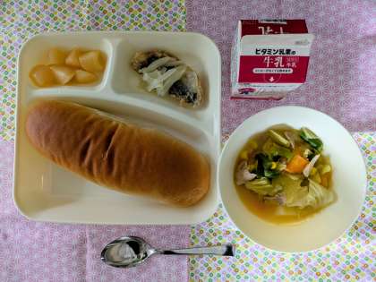 あじのレモンマリネ、てぼ豆のスープ煮、白桃(カット缶)、黒糖パン、牛乳