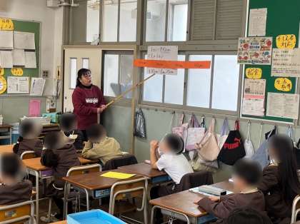 2年生は算数で「長さ」の学習をしています。1m20cmのように違う長さの単位を同時に使うときは、どのように表すのかを考えました。