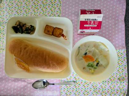 はくさいのクリーム煮、あつあげのピリ辛じょうゆかけ、豚肉とさんどまめのオイスターソースいため、コッペパン、みかんジャム、牛乳
