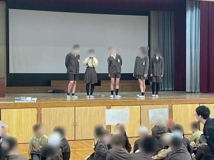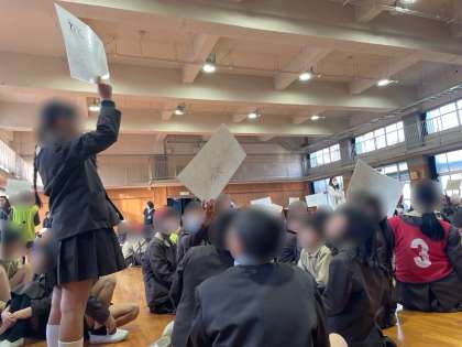 今週の児童集会は、たてわり班で協力して答える「だれでしょうゲーム」でした。集会委員会の児童が出す3つのヒントから、何の動物かを当てます。簡単なものから難易度の高いものまで、さまざまな問題が出題され、みんなで盛り上がりました。
