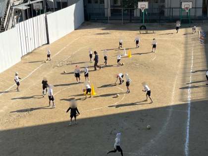 2年生は体育の学習です。サッカーボールを使って「たまごわりサッカー」というまとあてゲームをしました。投げるよりも蹴る方が難しいですね。ボールがまとに当たると子どもたちは大喜びです。