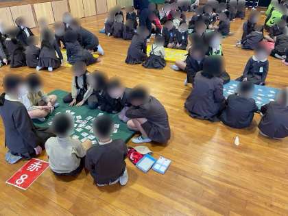 講堂で、毎年恒例のかるた大会を行いました。たてわり班の中でペアを組み、協力して取り札を取ります。少しでも早く札を叩こうと、集中して読み札を読む声に耳を傾けていました。最後の結果発表では、15枚以上取れたペアに大きな歓声と拍手が送られました。