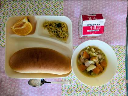 ポトフ、カレーソテー、いよかん、黒糖パン、牛乳