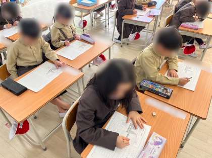 1年生は算数で「おおきいかず」の学習をしています。これまでの学習を踏まえ復習プリントに取り組みました。子どもたちは10のまとまりを意識して大きな数を数えることができていました。