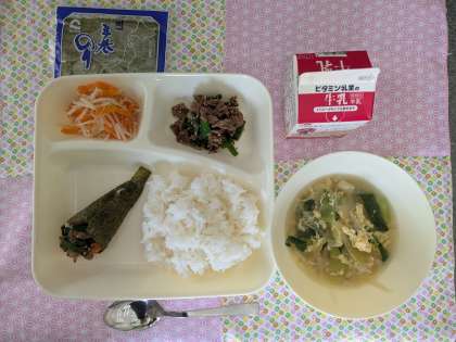 キンパ(肉)、キンパ(ナムル)、焼きのり(手巻き)、卵の中華スープ、ごはん、牛乳