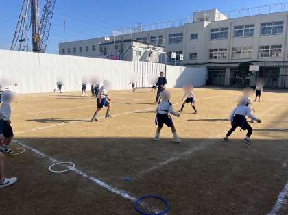 2年生は体育で「宝はこび鬼」という遊びをします。宝物に見立てたボールを敵陣地奥に運ぶゲームです。子どもたちは上手く敵をかわすために走るスピードやコースを考えながら楽しくプレーしました。