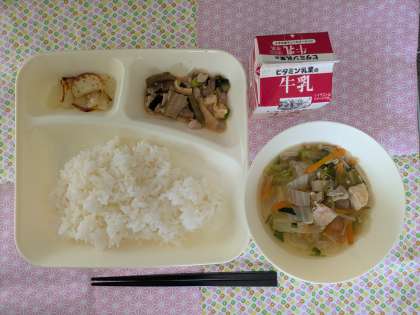 豚肉と干しずいきのみそ煮、五目汁、焼きじゃが、ごはん、牛乳