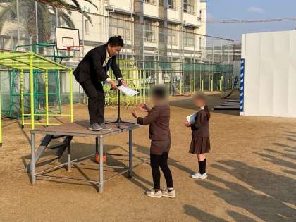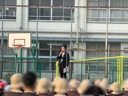 今週の児童朝会は、やわらかな日差しの中で行うことができました。児童朝会での校長先生のお話の中に、「善因善果 悪因悪果」という言葉が出てきましたが、どのような意味か、ご存じですか?気になる方はぜひ調べてみてください。校長先生のお話の後は、大阪市児童絵画・版画展の表彰を行いました。