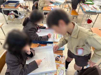 1年生は図工の学習で「おはなしすごろく」という作品を制作しています。空き箱の底にマスをかき、その中にお話を書き込んでいきました。お友達と見せ合いながら工夫していきました。